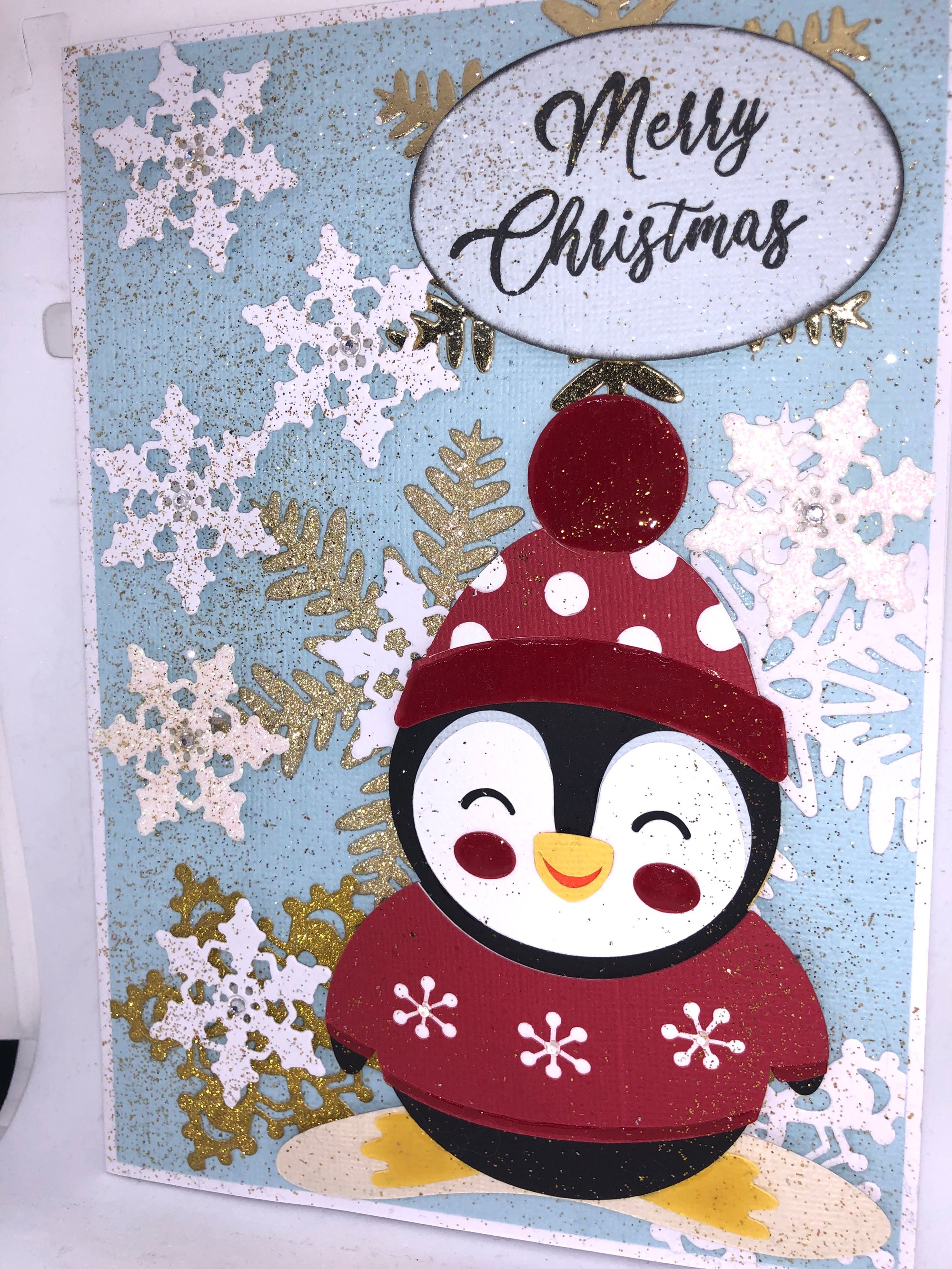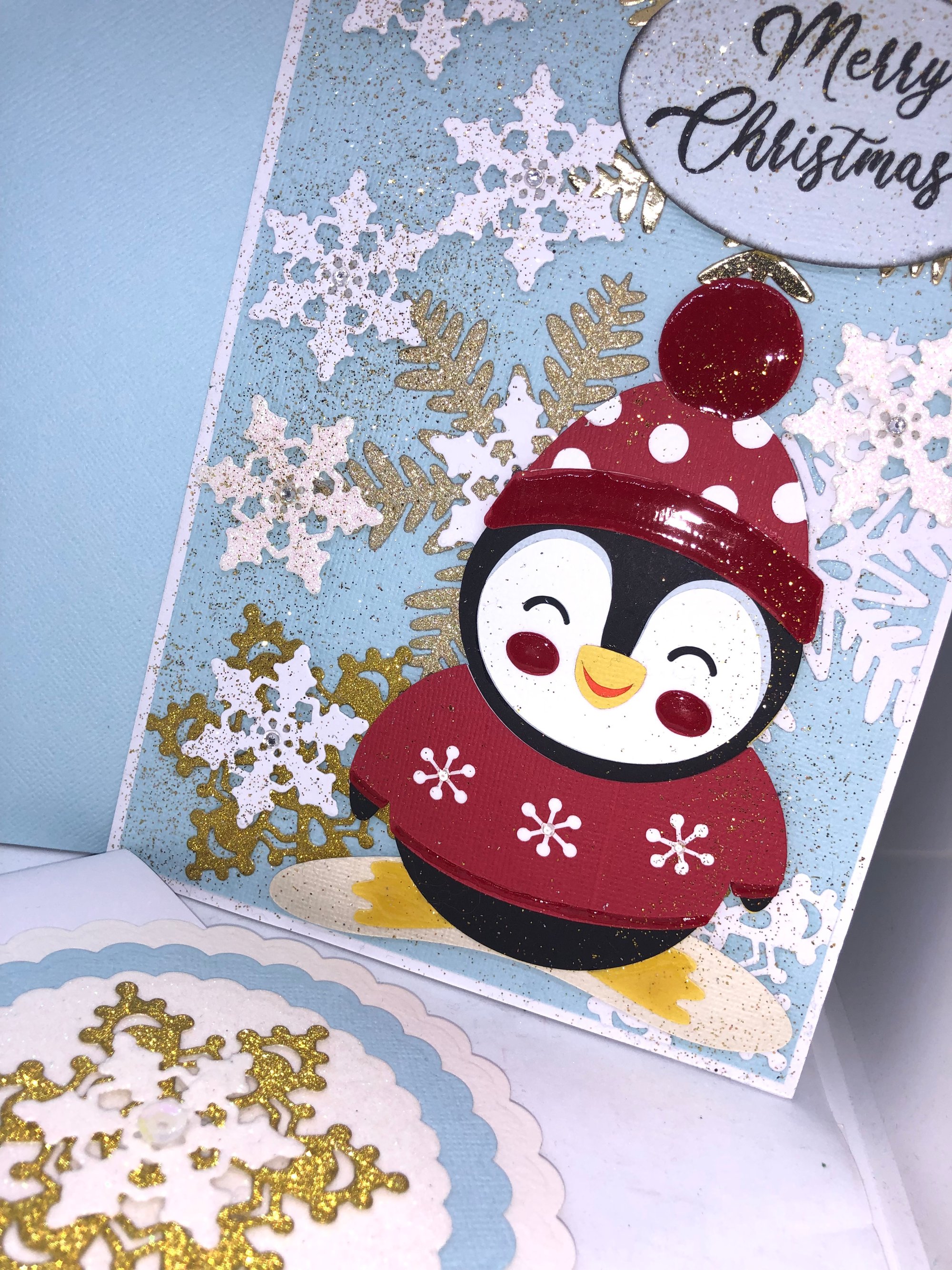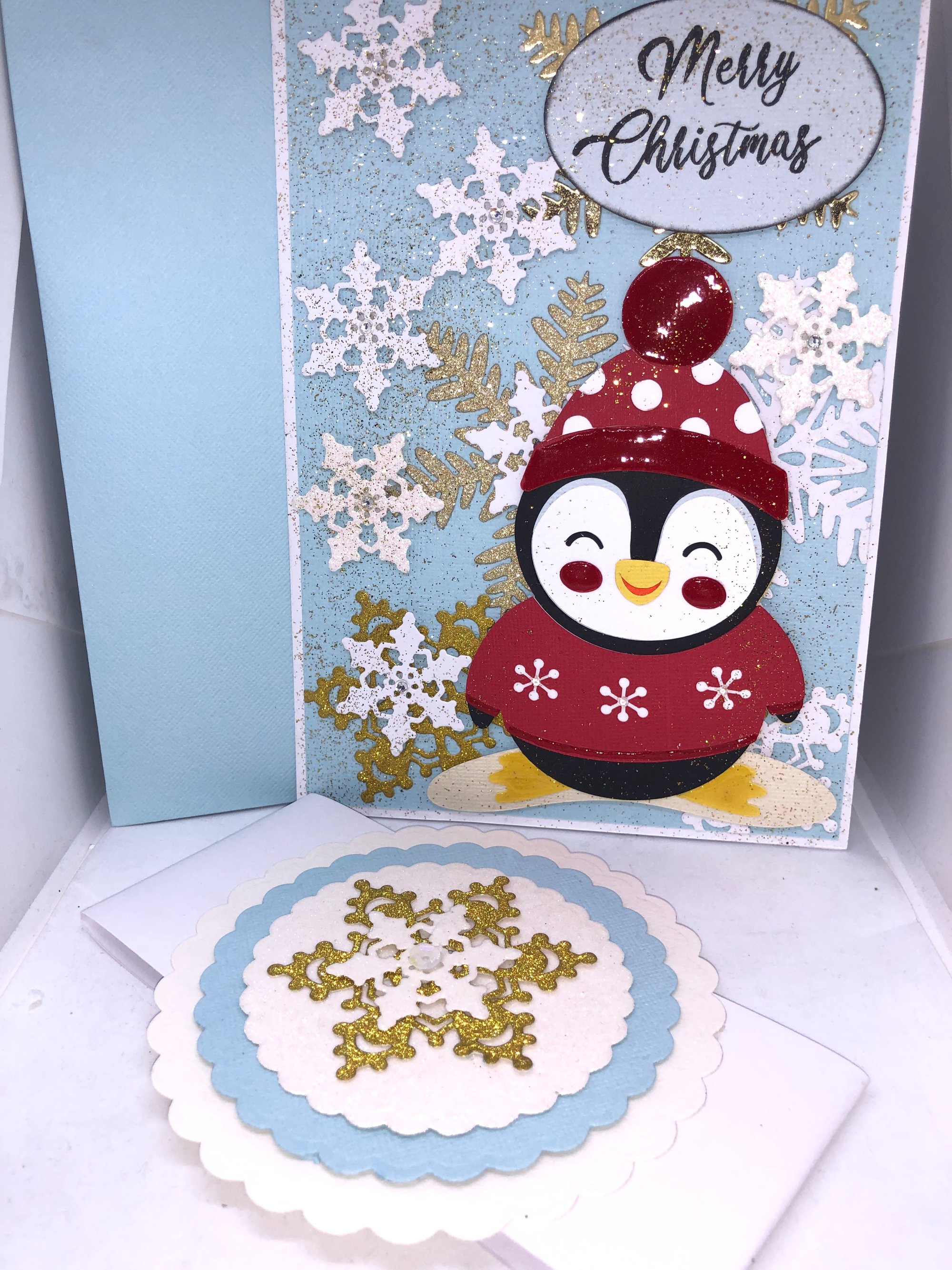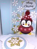 - Handcrafted Christmas Penguin card with Matching envelope and Belly band all